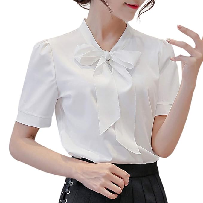 Xlnuln Women Work Office Short Sleeve Bow Tie Solid Tee